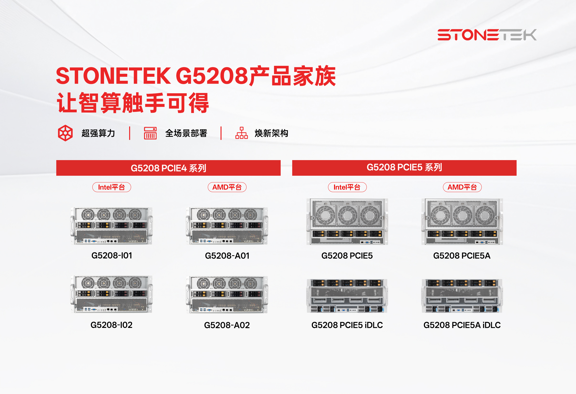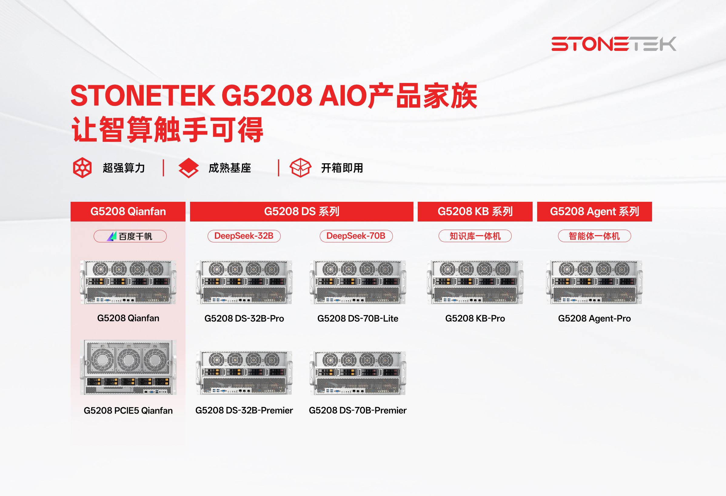 基于STONETEK SuperSvr G5208 AI智算服务器平台打造的一系列开箱即用的AI一体机解决方案产品。针对不同应用场景搭载定制化软件与功能组件,覆盖从模型推理、知识库管理到智能体开发等多种业务场景,帮助企业快速构建私有化AI平台,降低部署与运维复杂度,获得中国信通院“算模数用一体机”5A卓越评级。